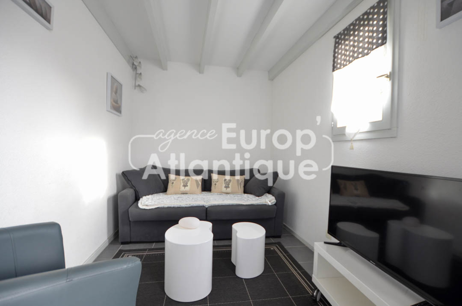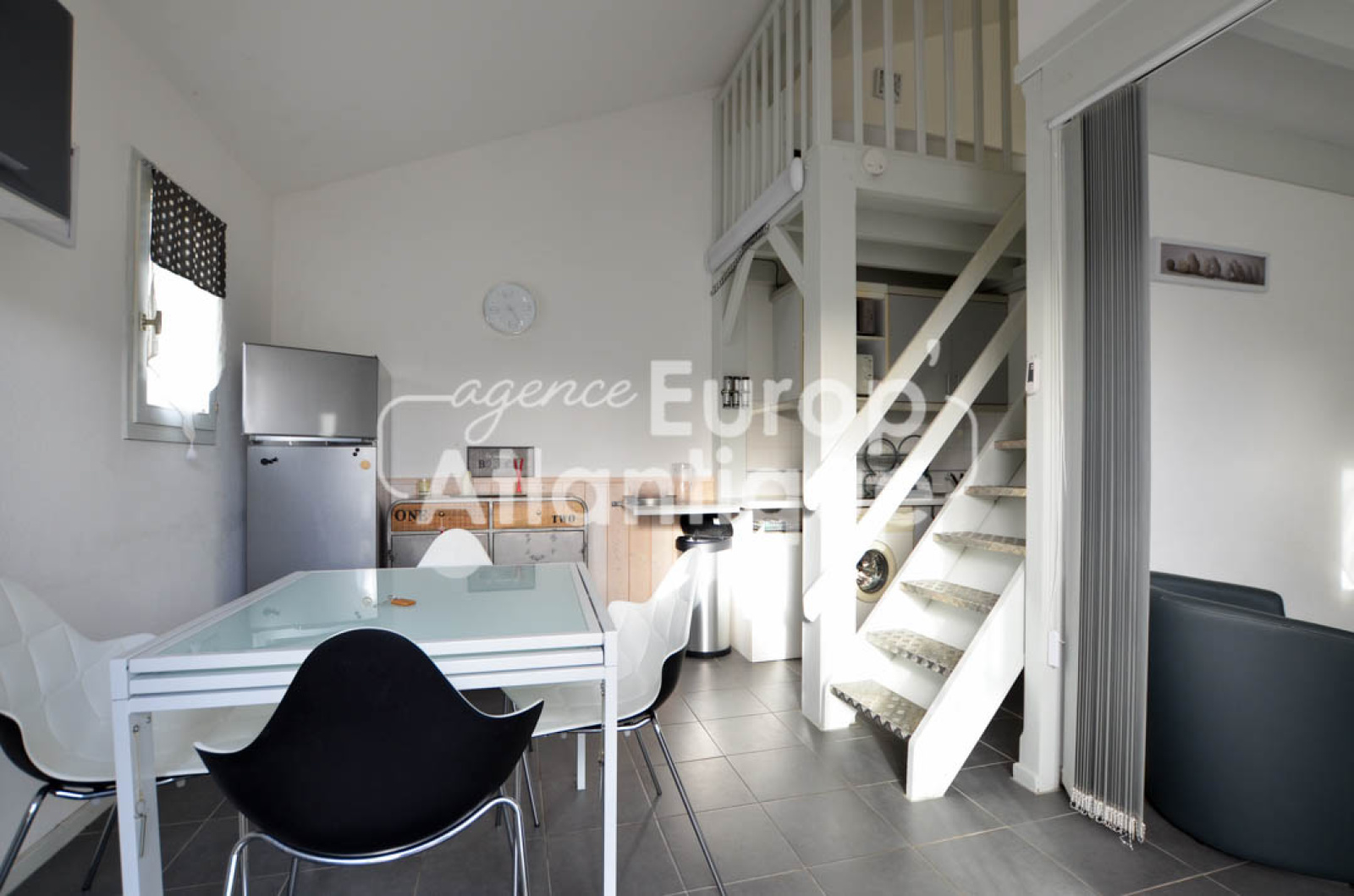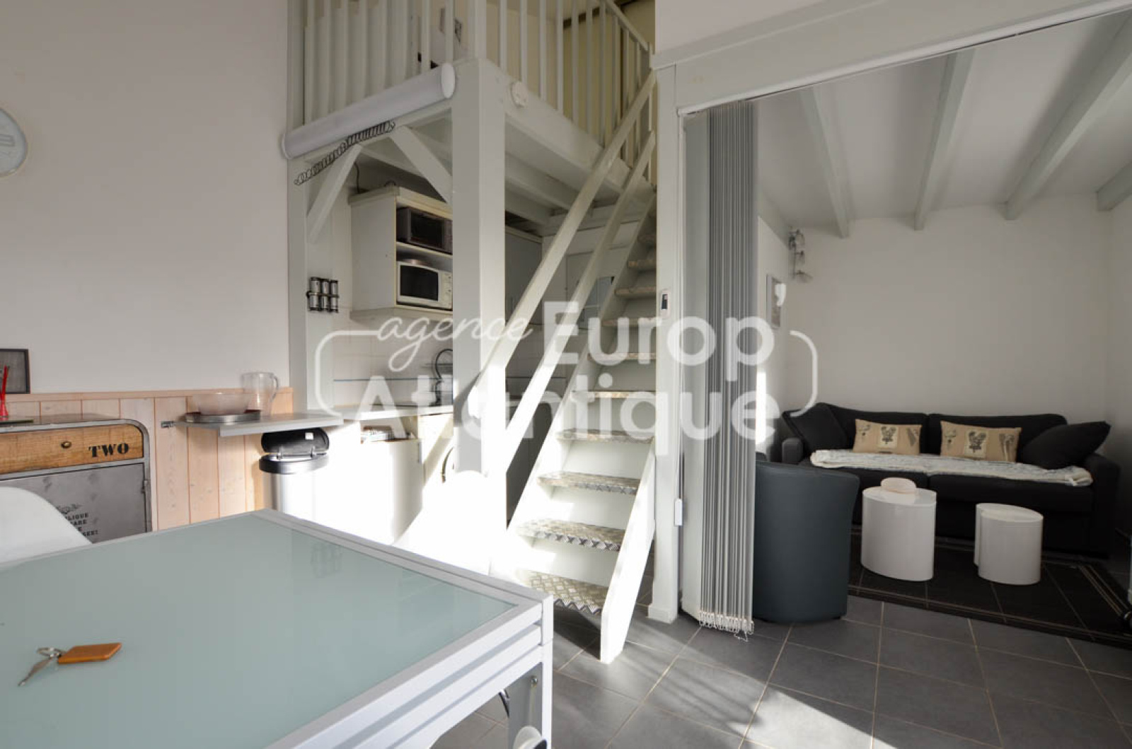 Au rez-de-chaussée: Une pièce de vie lumineuse avec cuisine aménagée, un coin salon avec cloison amovible pouvant être transformé en chambre