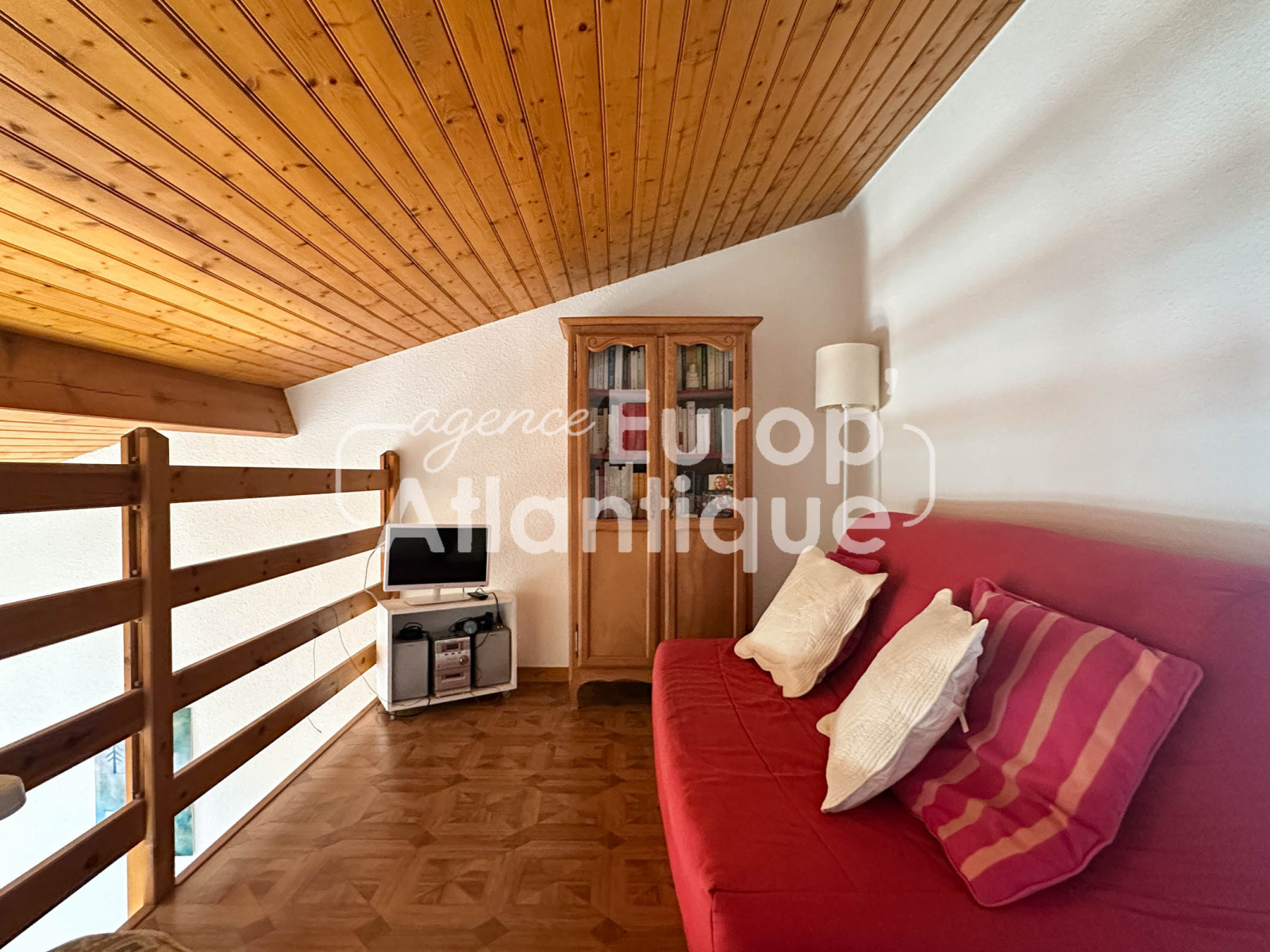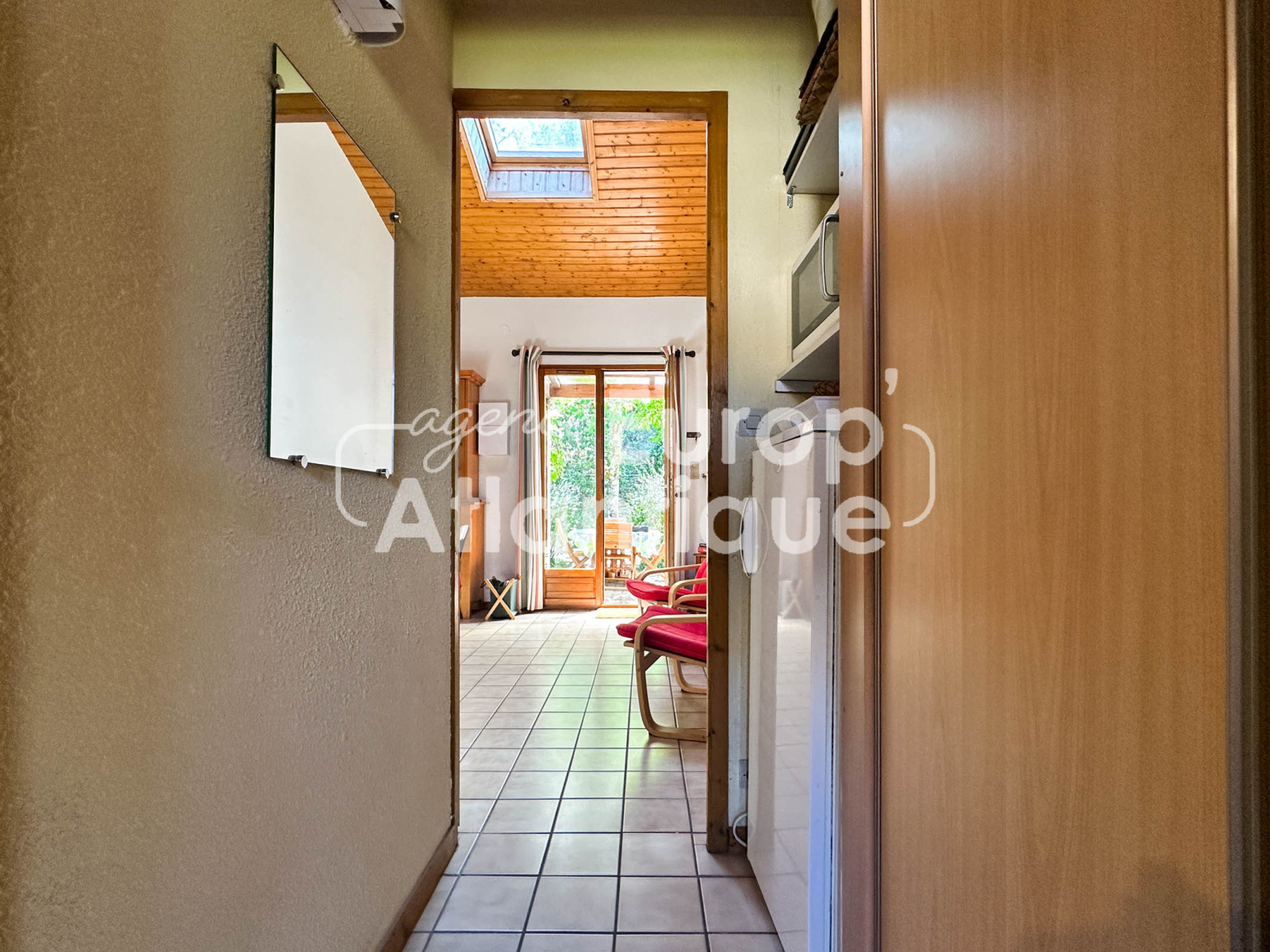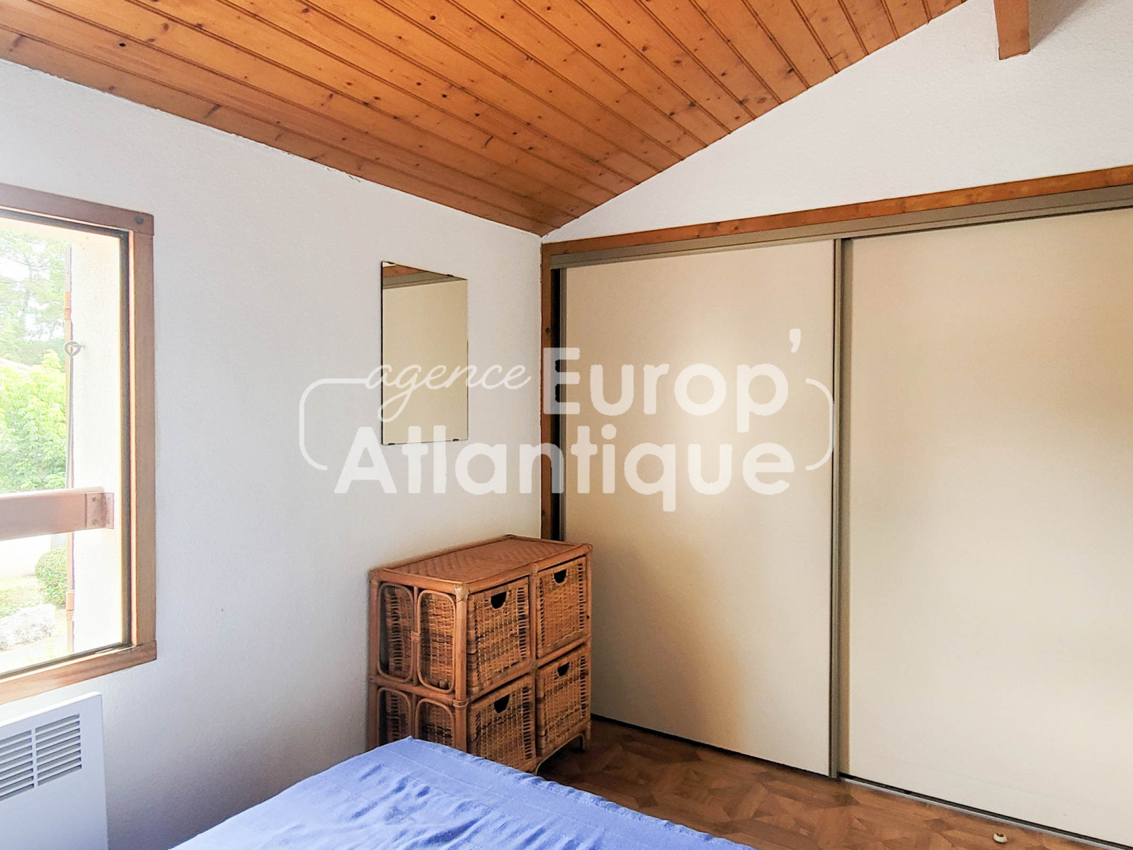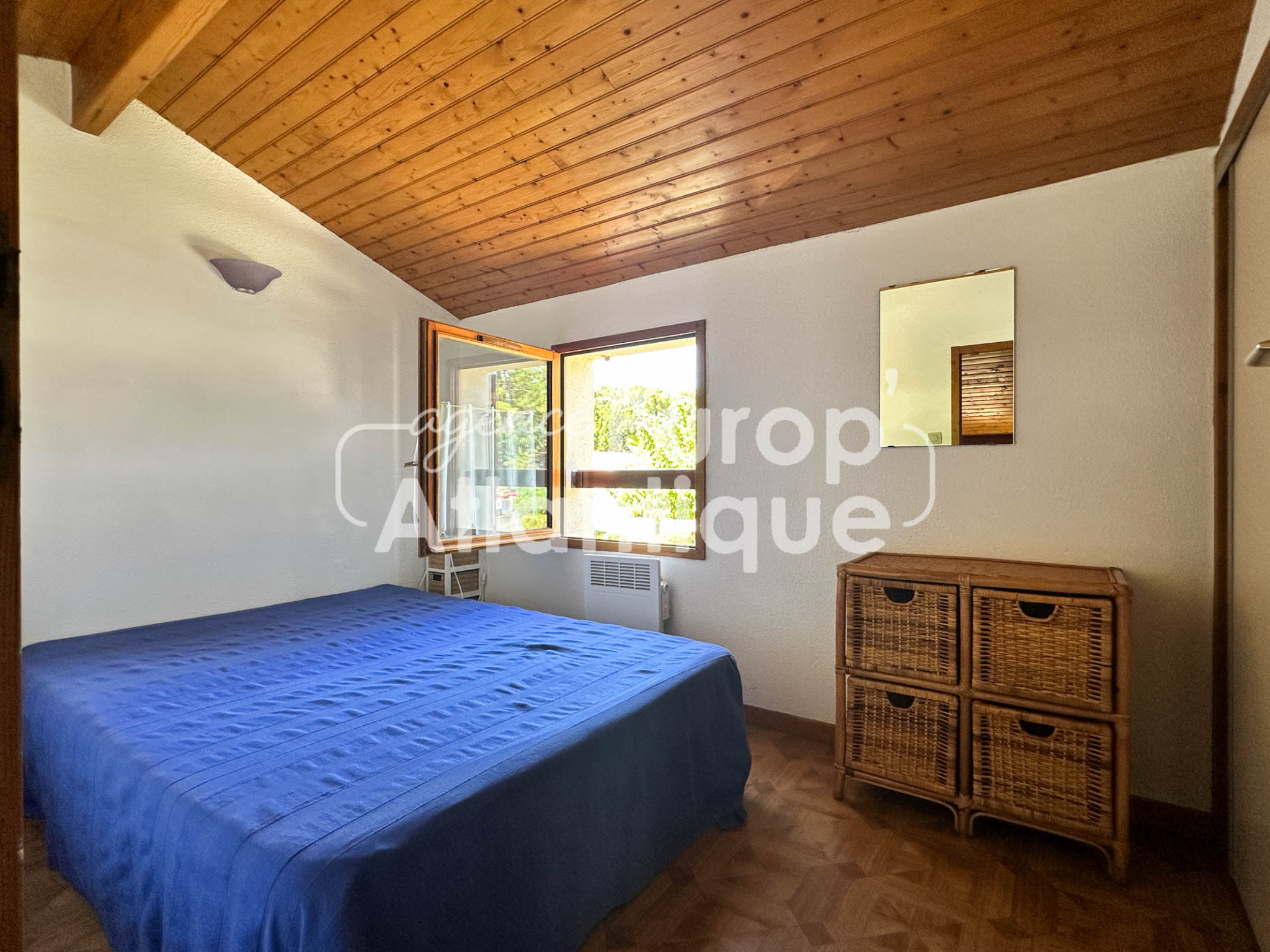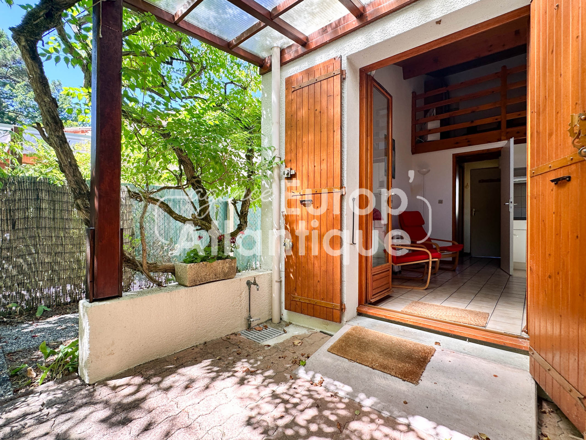 Maison mitoyenne d'angle de 43m² utiles comprenant : Séjour de 14.8m² avec kitchenette équipée, dégagement desservant une chambre de 7.72m², salle d'eau avec wc et LL. A l'étage : Mezzanine, 2ème chambre (7.72m²) avec placards. Jardin d'angle avec cabanon. Vue sur pinède.