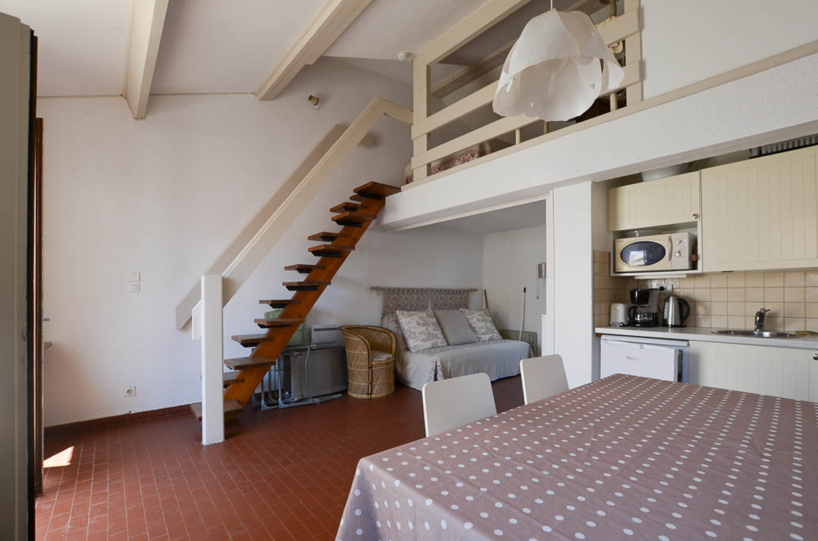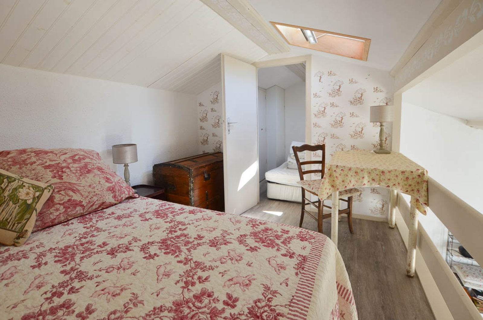 Maison mitoyenne de 45m² environ comprenant: Séjour de 26m² env avec coin cuisine équipé et cheminée, coin repos, salle de bains avec wc. A l'étage mezzanine, Chambre mansardée avec vélux.