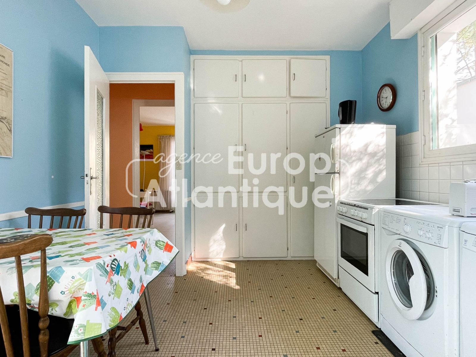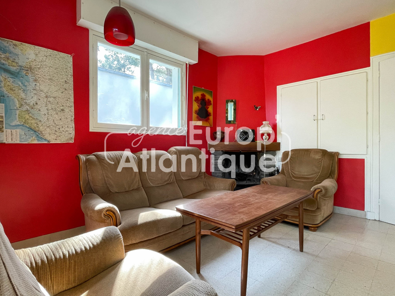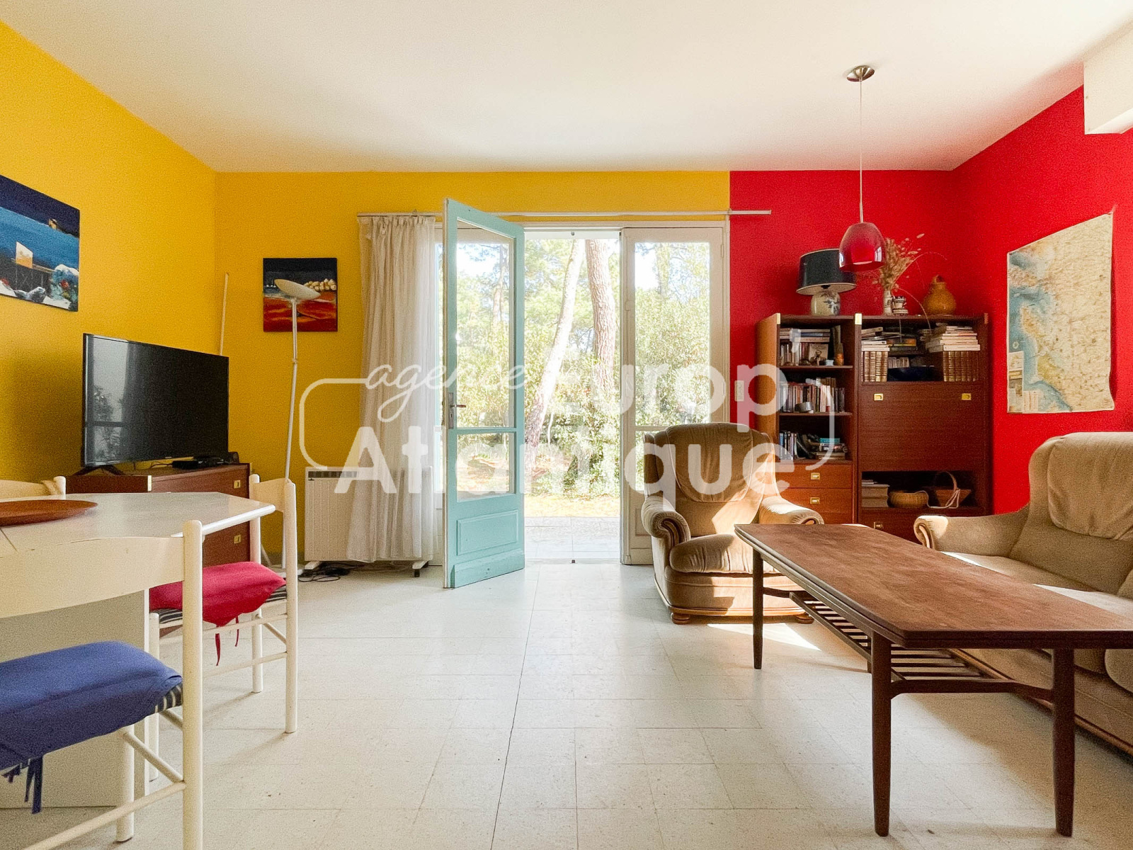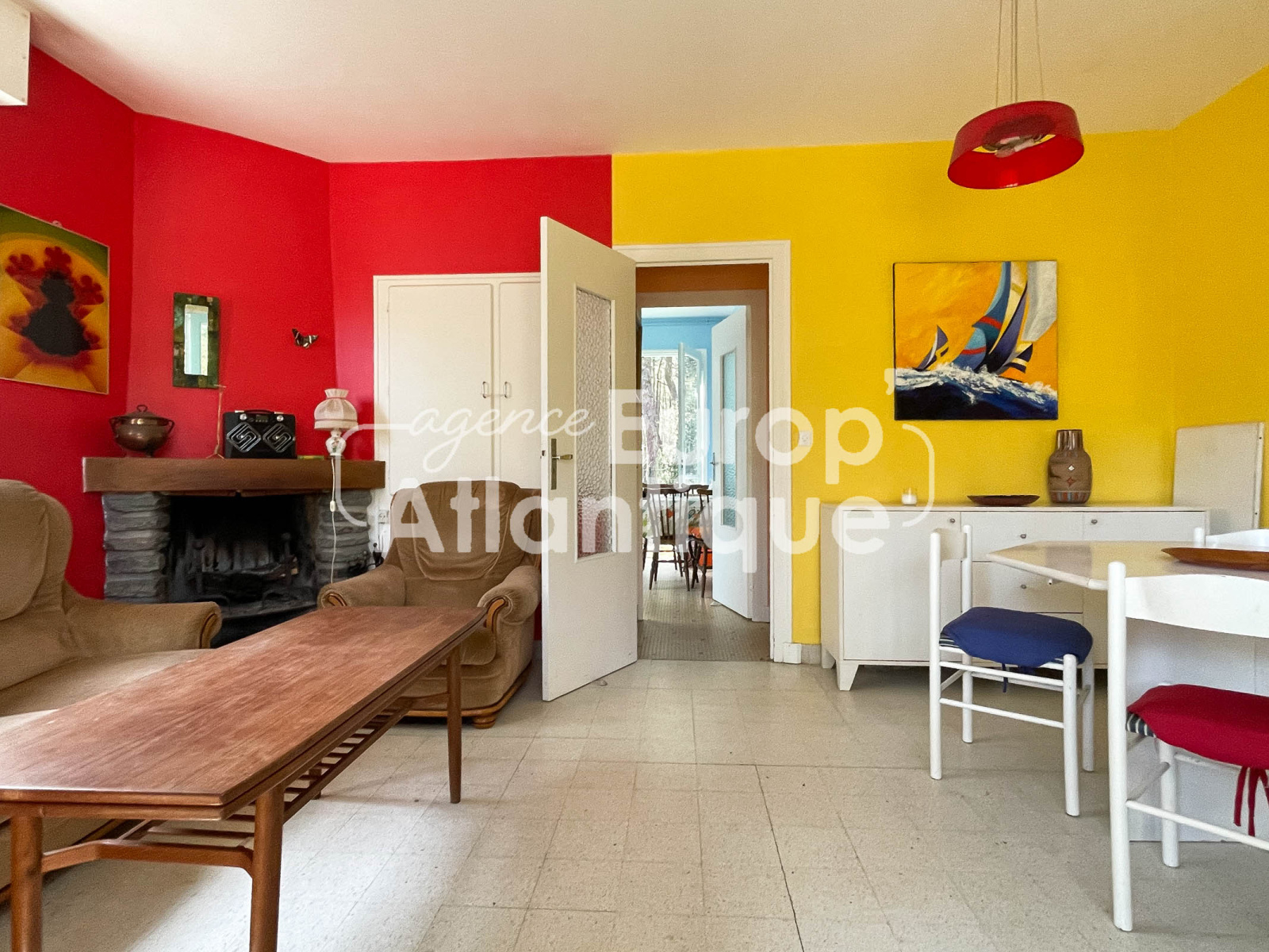 Salon/salle à manger avec cheminée ouvert sur extérieur exposé est, cuisine séparée avec porte fenêtre donnant sur jardin arrière exposée ouest.