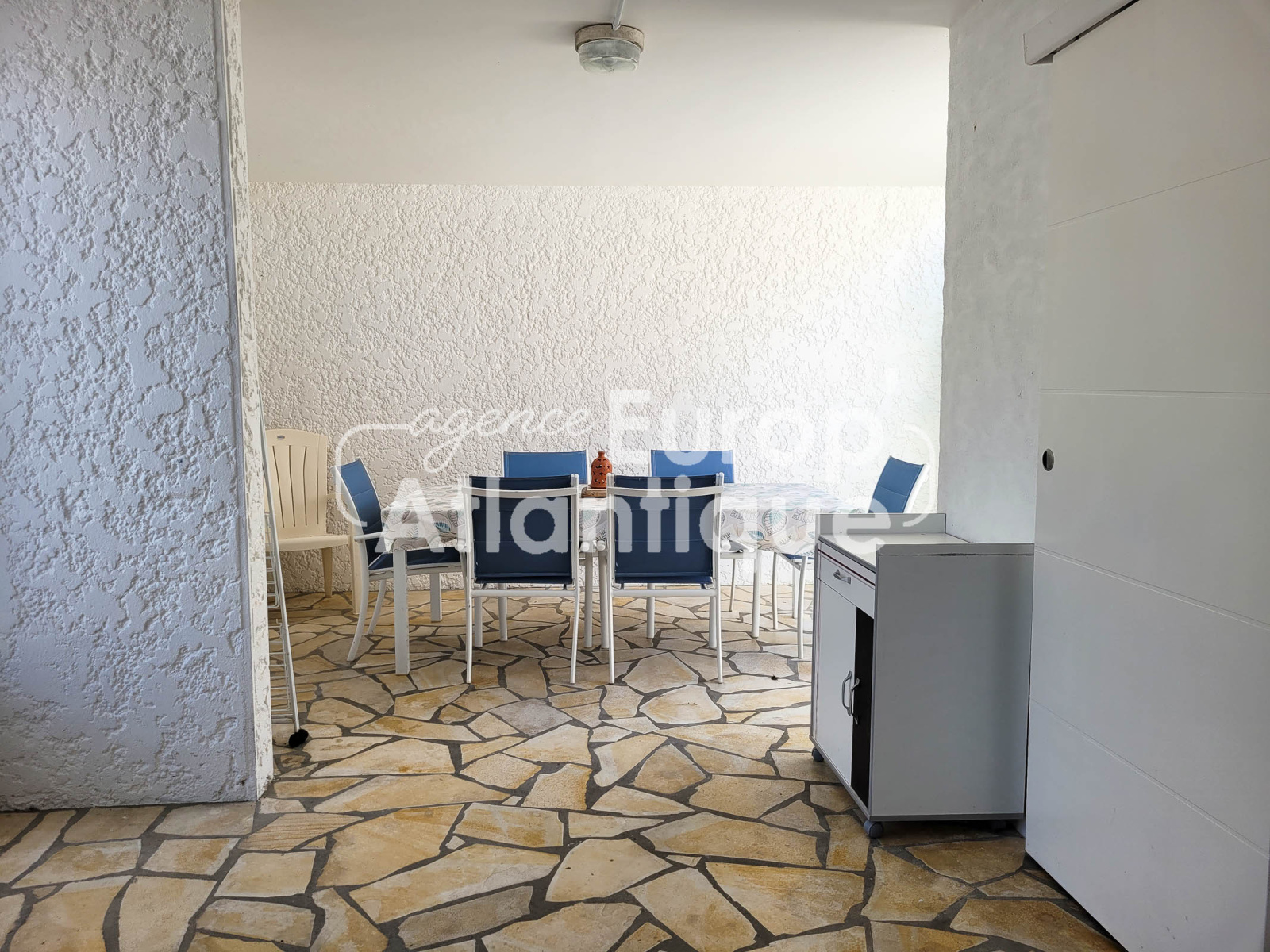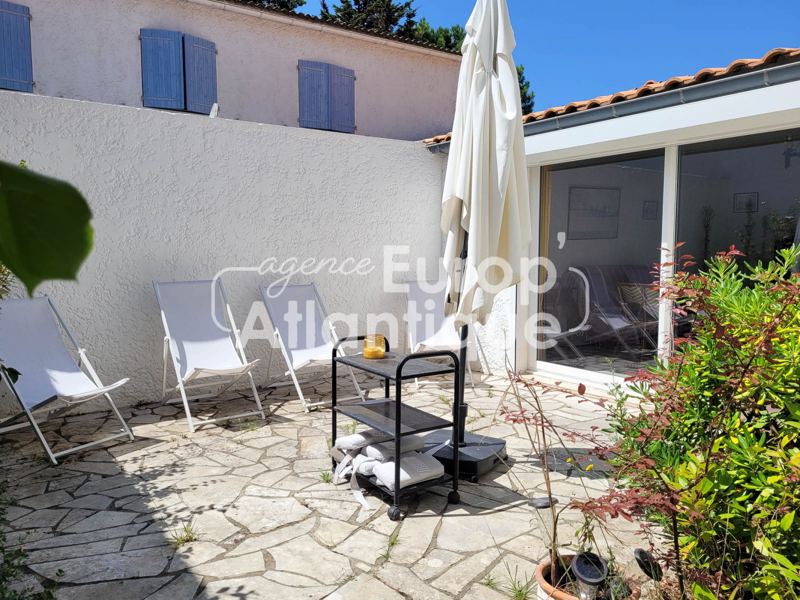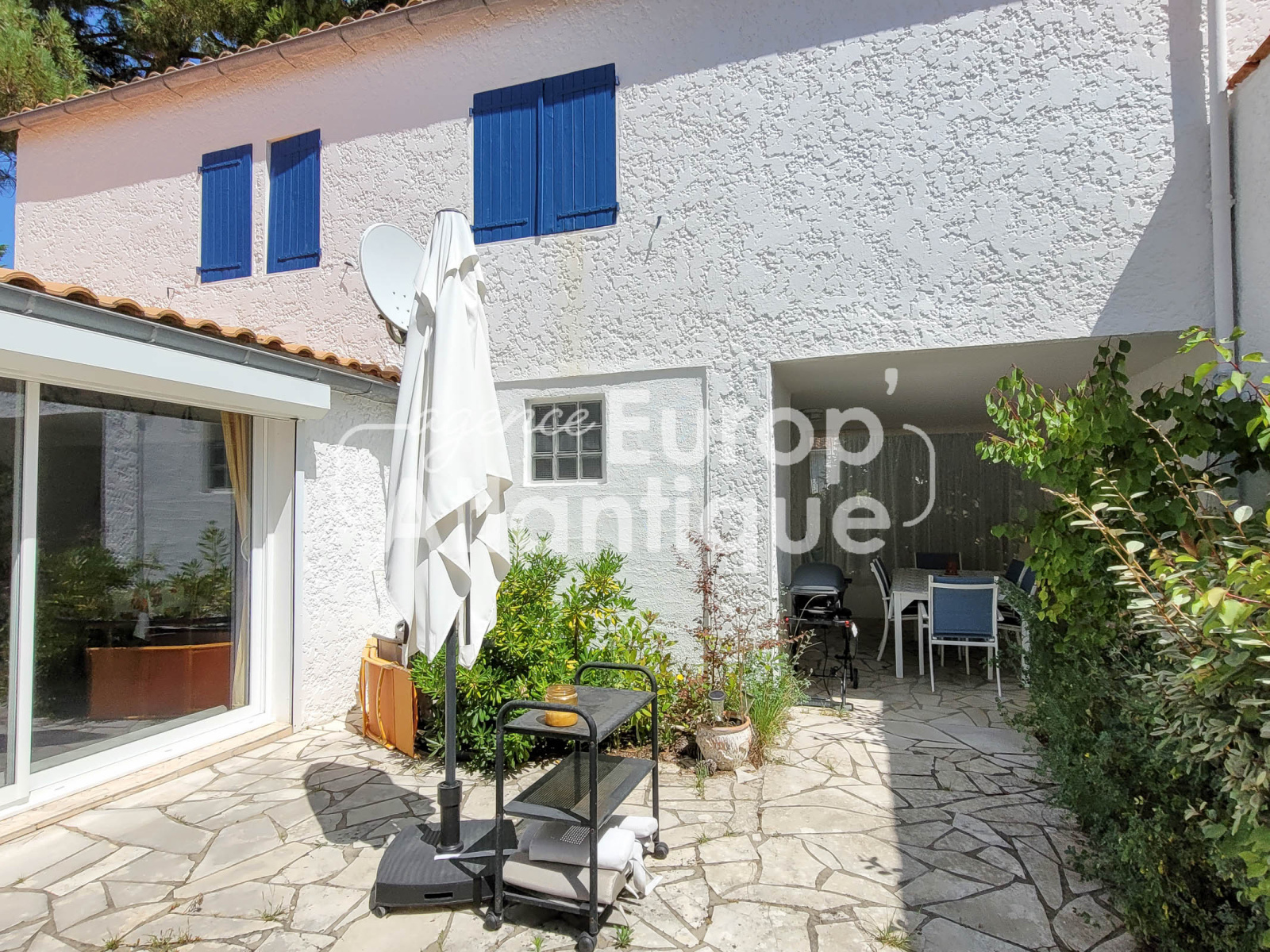 Patio en partie couvert et clos avec douche retour de plage. Parking.