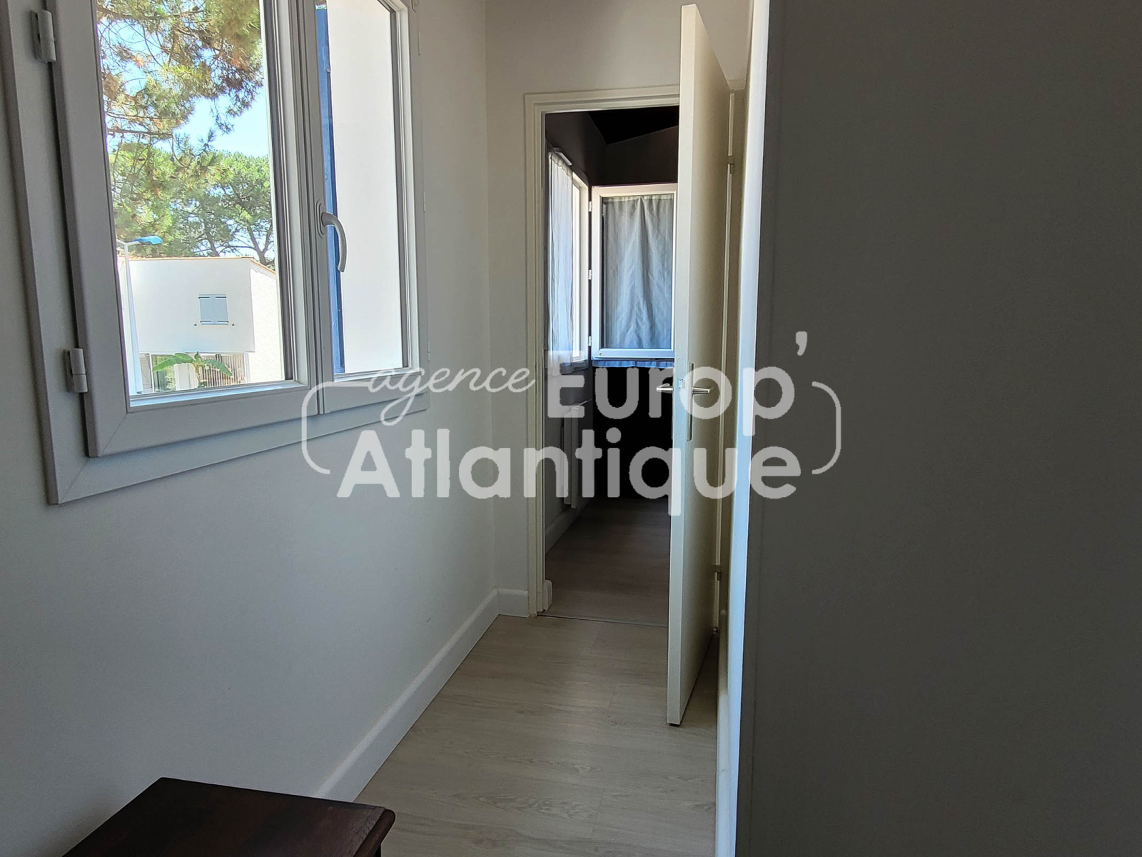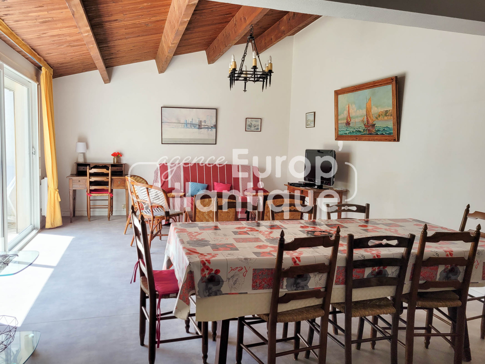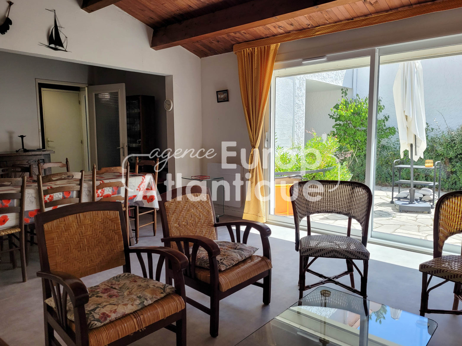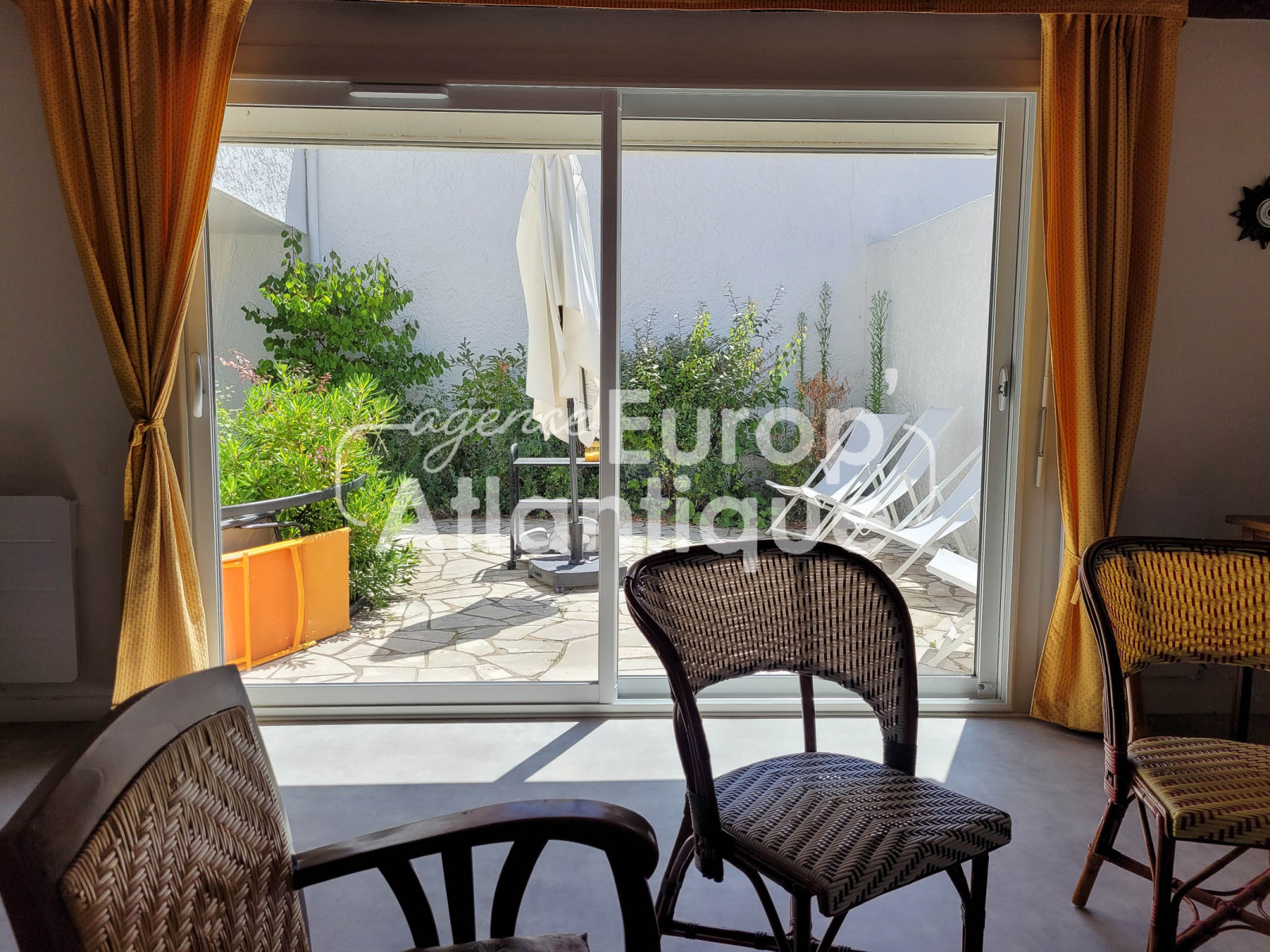 Patio en partie couvert et clos avec douche retour de plage. Parking.