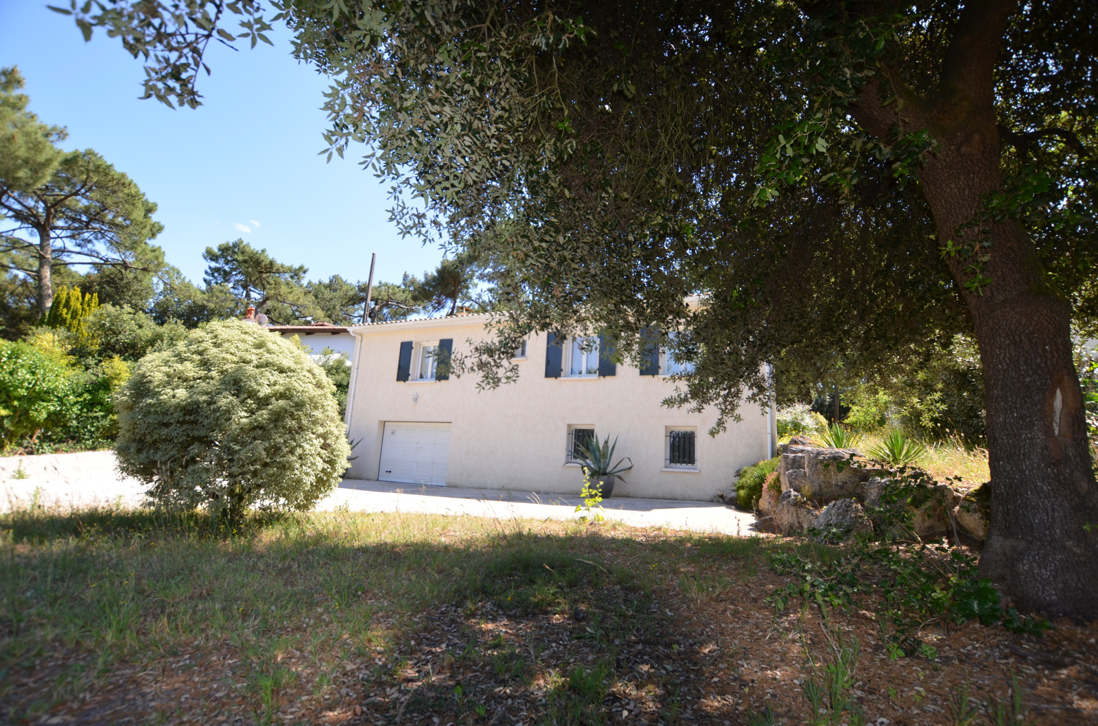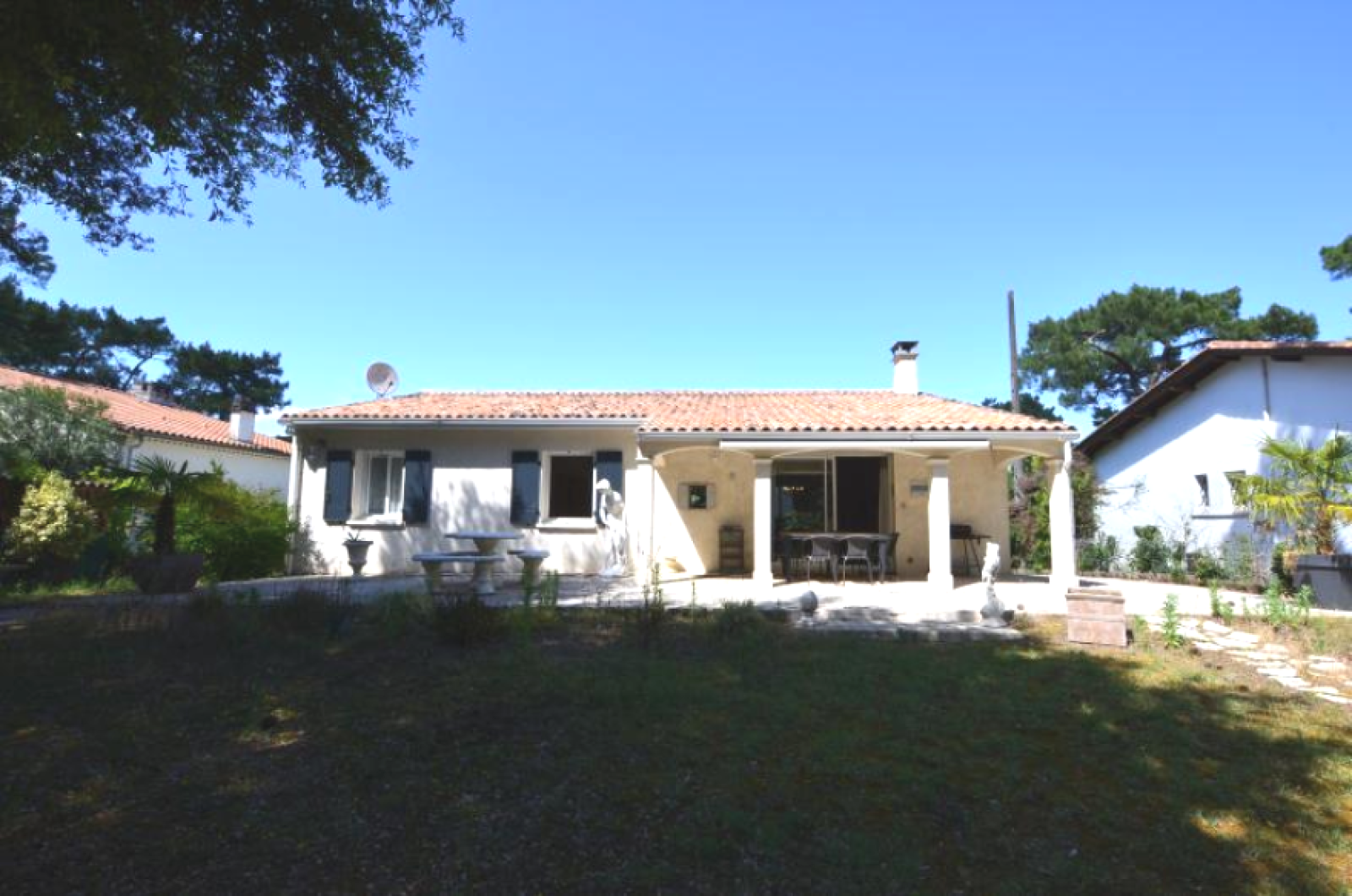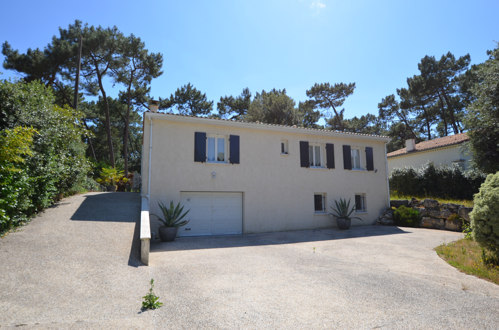MAISON Rez de chaussée surélevé de 4 pièces principales sur 116 m2 environ, comprenant : Entrée dans Belle pièce de vie de 54 m2, ouvrant au Sud sur terrasse, avec insert et Coin cuisine équipé, 3 Chambres (13.05m² - 11.90m² -11.74m² )avec placards coulissants, Salle d'eau, WC. TERRASSE couverte exposée sud - Belle vue sur PInède - SOUS-SOL TOTAL de 118m² : Grand Garage 2 voitures, remise bateau ou remorque, accessible de l'intérieur par ascenseur, coin lingerie. Porte garage et portail Alu à commande électrique. Forage . Chauffage électrique et Clim réversible. Abri bois. Stationnement en béton désactivé. BEAU TERRAIN arboré de 968 m².