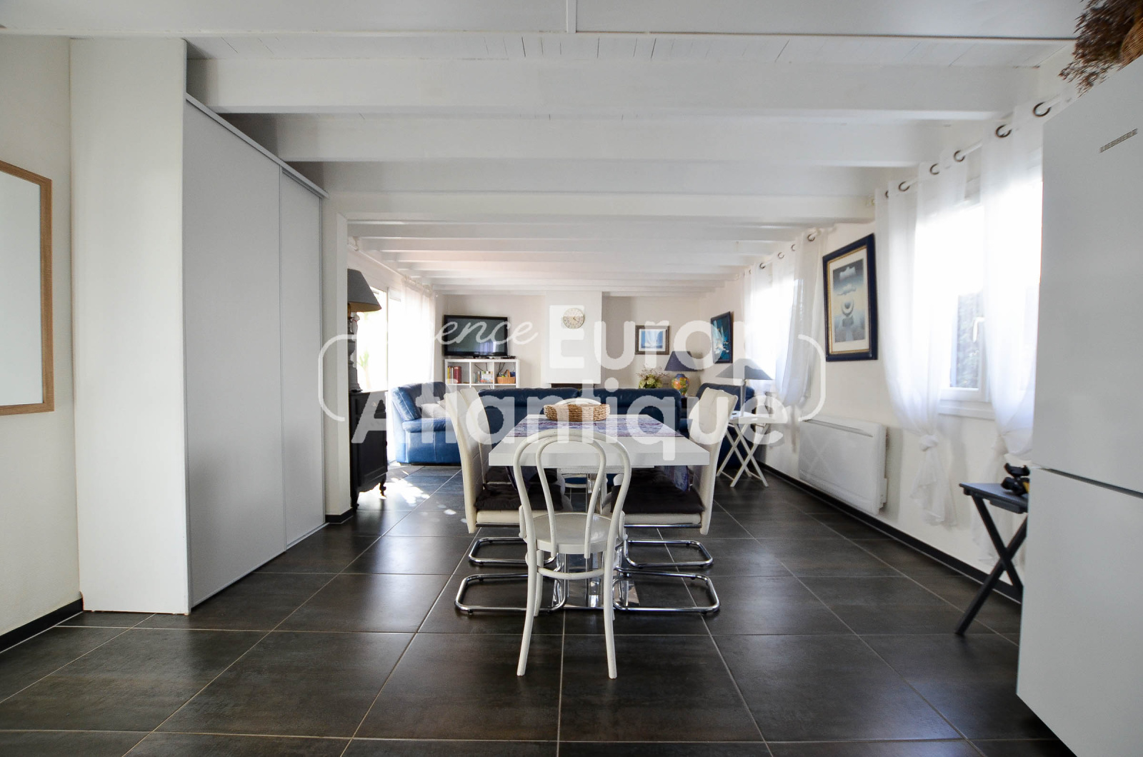 Pièce de vie exposée au sud de 35 m² avec cuisine neuve aménagée et équipée, ouverte sur séjour traversant avec insert.